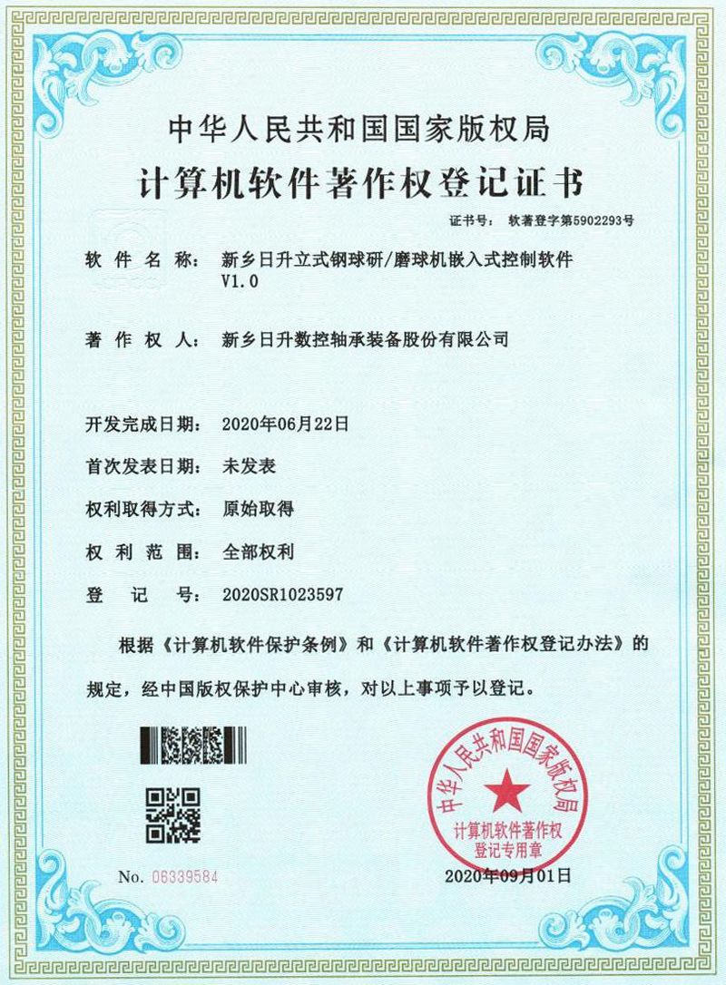 近日,我公司 “新鄉(xiāng)日升立式鋼球研/磨球機嵌入式控制軟件 V1.0” 獲得國家版權局“計算機軟件著作權”登記。 該項軟件主要功能有手動操作,自動工藝參數(shù)設定加工,工作壓力自動調(diào)整,報警顯示,設備點檢等功能。軟件功能完善,性能穩(wěn)定,易于操作,自動化程度高,人機工程好,應用廣泛。 該軟件著作權的登記,可以對上述機床的控制程序進行充分保護,也將為保持公司在鋼球裝備行業(yè)的領先地位起到積極的作用,從而提高鋼球加工裝備行業(yè)整體自動化和智能化程度。