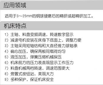 本機(jī)床是軸承廠和專業(yè)鋼球制造廠加工鋼球用的專用機(jī)床,適用于3~25mm的鋼球硬磨后的精研或超精研加工。(對(duì)于直徑3 mm ~5 mm的鋼球還可以進(jìn)行硬研加工以代替硬磨工序。)經(jīng)本機(jī)床加工后的鋼球精度可達(dá)G10~G5級(jí)。